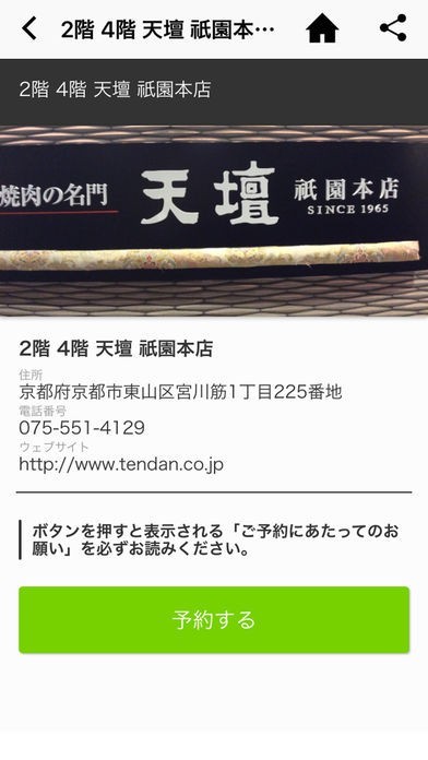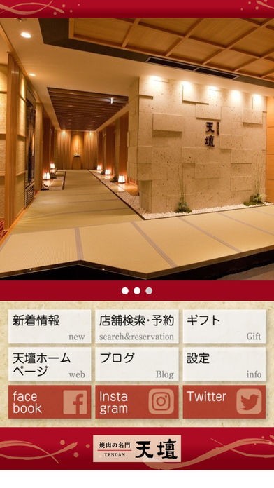 「焼肉の名門 天壇」は、京都発の焼肉専門店による公式アプリです。 新着情報からは最新ニュースやお得な情報を随時配信する他、公式ホームページへや公式Instagramへのリンクなども充実しています。 店舗検索機能を搭載しており、近隣にあるグループ店の検索も可能。 検索結果から詳細な店舗情報を確認することもできるようになっています。
