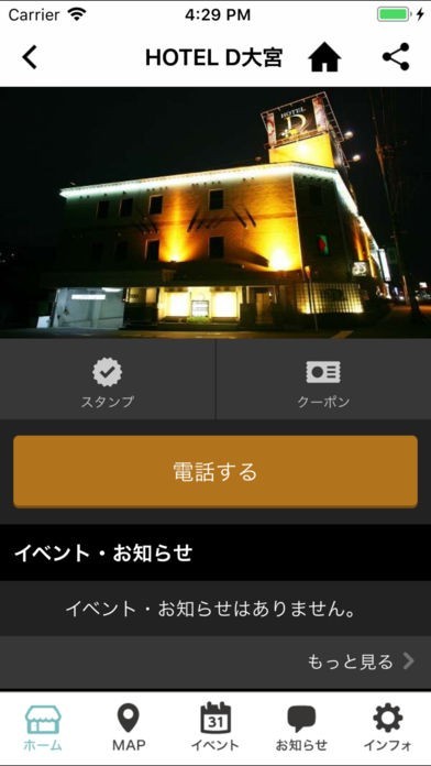 当グループアプリの中では、最新イベント情報やアプリ限定クーポンの配信、各店舗のルームサービスや設備情報などもご覧いただけます。