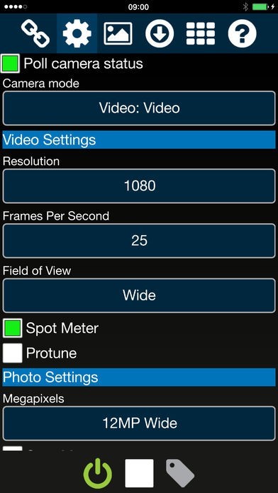 - Control all important camera settings (including resolution, frame rate, camera mode, Protune, ...).