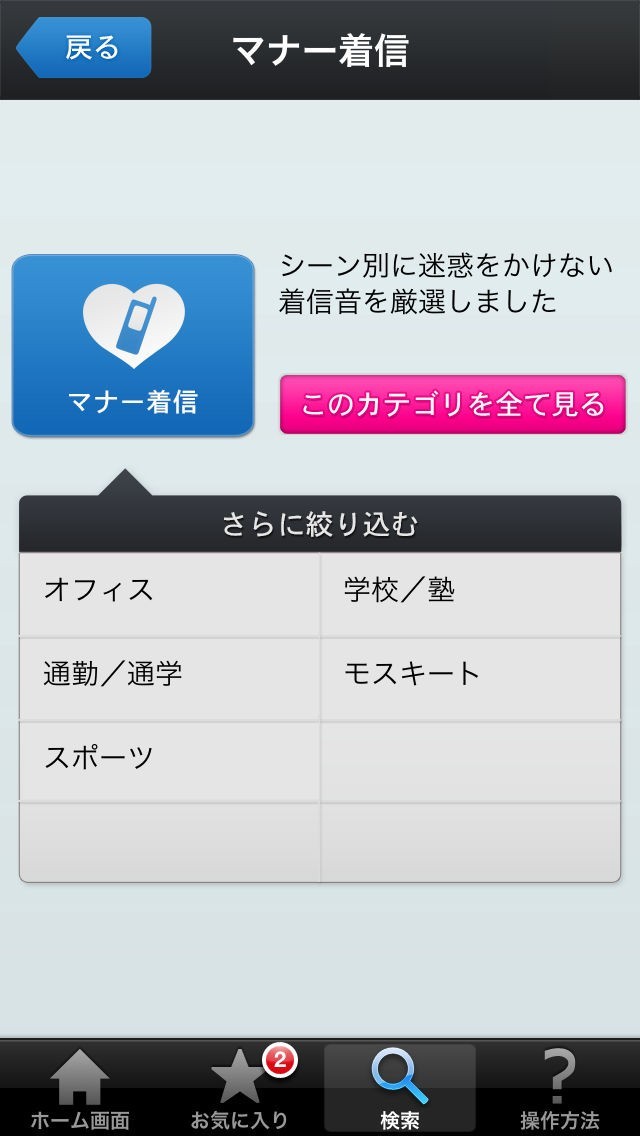 複数の着信音が用意されているので、自分好みのBGMも素早く探せるでしょう。シーン別に着信音を検索する事が可能で、好きなコンテンツを「お気に入り」に追加出来るようにもなっています。