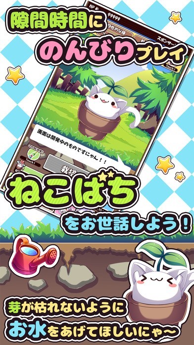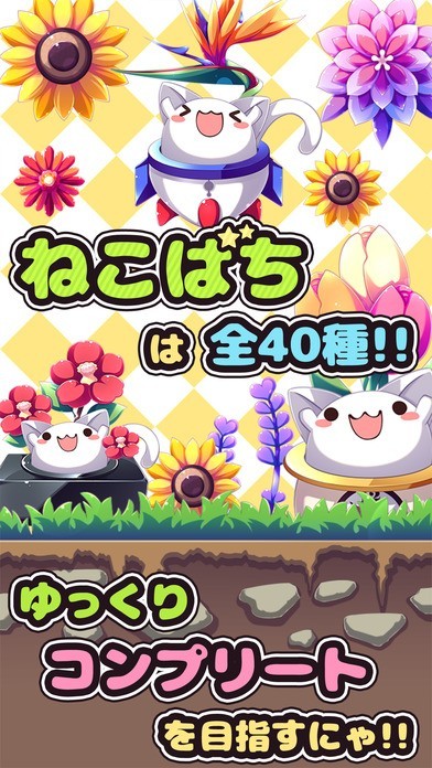 「ねこばち!」!植木鉢に入ったかわいいにゃんこを育てて、色々な花を集めましょう!のんびりすきま時間癒しゲームです!!