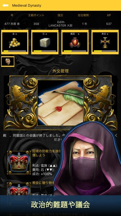 - 政治的難題や議会、王室との複雑な人間関係に対応しよう。