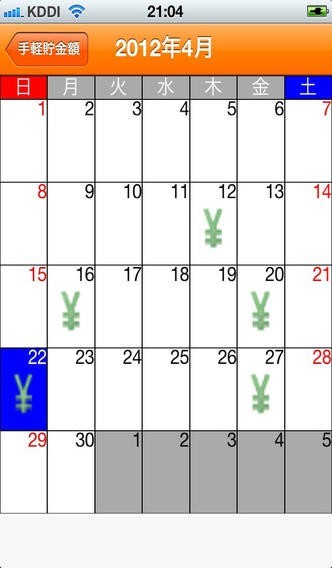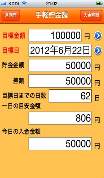 手軽貯金箱は一定の日までに貯金をしたい場合、その日までに一日あたりどれくらい貯金をしたらよいか自動的に換算してくれるアプリです。目標金額と、日にちを入力すると一日当たりの貯金額が出てきて、貯金をしたら表示画面から金額を入力します。カレンダーでいつ貯金したか一目で分かるので便利です。またロック機能もありますので、貯金しているのを知られたくない方などには有難い機能です。気軽に目に見える形で貯金をしたい方には、使ってほしいアプリです。