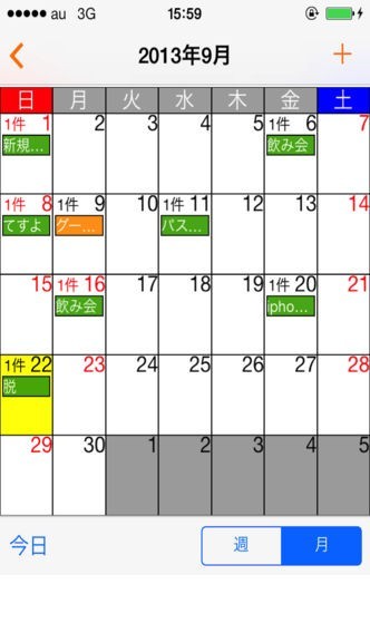 の表示形式で、スケジュールの内容を週と月の画面で