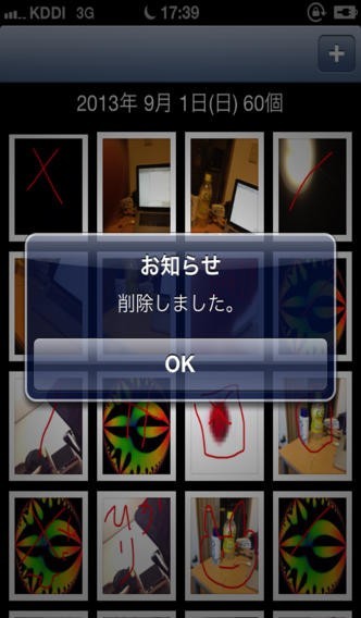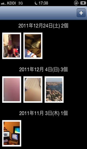 このアプリでは撮影した日時によって写真が分類されるので、いつ撮ったのかを把握しておけばすぐにお目当ての写真をすぐに発見することが出来ます。 また、日付の横に個数が表示されていることからその日に何枚撮影したのかもすぐに把握することができます。 他には、写真に左下の青、赤、白のボタンをタップすることによってその文字の色で写真に落書きが出きっちゃうので、素敵な思い出をさらに楽しいものにしたり、メッセージを添えてプレゼントしたりすることができるようになります。 他にはツイッターとフェイスブックボタンも用意されており、タップするだけで投稿できます。