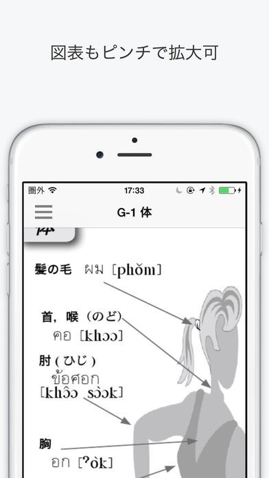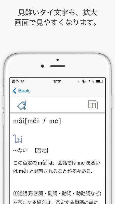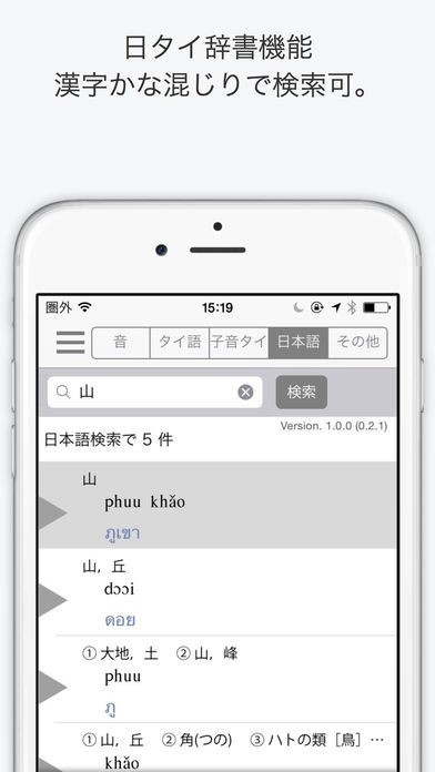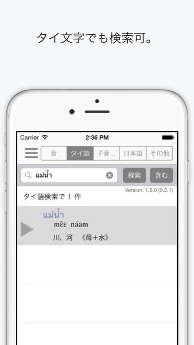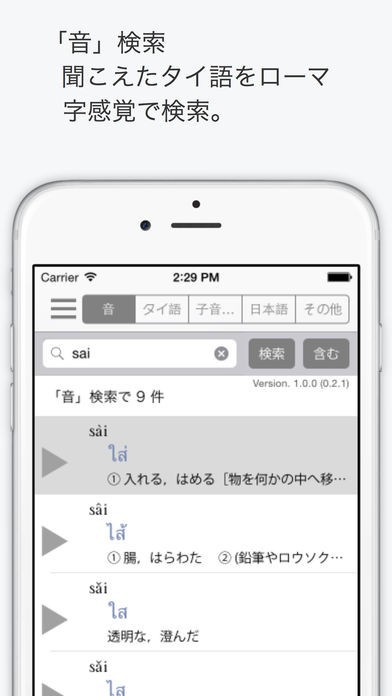 日本人には馴染みの薄いタイ語を音からローマ字をイメージして検索するという便利な辞書です。聞こえたタイ語を似たローマ字に変えて入力すれば、候補の単語が表示されるので調べる手間を大幅に減らすことができます。