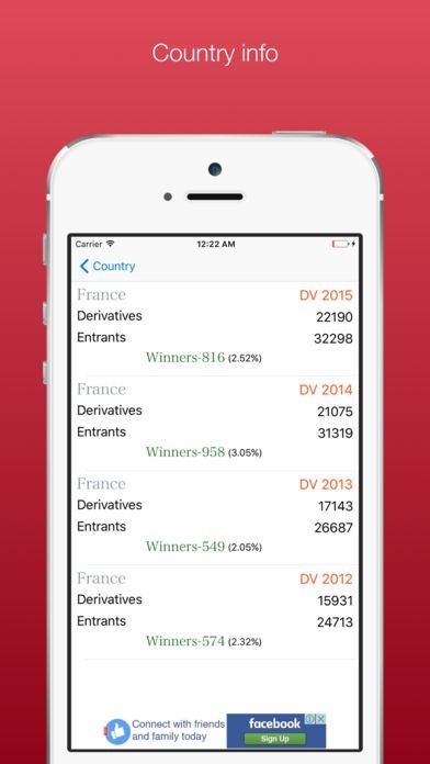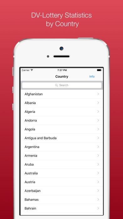 App Storeより引用The application enables the users to view DV Lottery statistics in a convenient format. The statistical data provided in this application is collected from the official information resources given at http://travel.state.gov/content/visas/en/immigrate/diversity-visa/diversity-visa-program-statistics.html. Currently we have available statistics for the following years: 2012, 2013, 2014, and 2015.