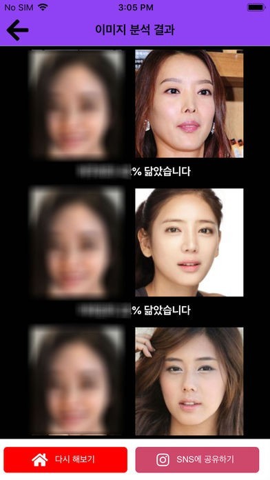 4.Sns에 공유한다 / 닮은 연예인 프로필을 찾아본다 /다시 한번 찾아본다.