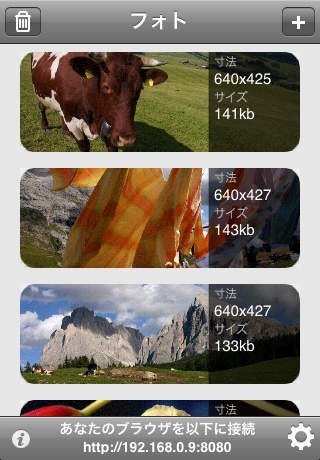 WiFiPhoto は高品質のフォトをあなたのカメラロールまたはフォトライブラリからどんなコンピューターにもWiFiネットワークを通して高速で送信できます。ドッキングやUSBケーブルは必要ありませんん。品質も損なわれません。フォトを選び、ブラウザー(サファリ、ファイヤーフォックス、インターネットエクスプローラー)でWiFiPhotoのメインページの底部に表示されているウェブアドレスへ行ってください。あなたのフォトを全部zipしたアーカイブもダウンロードできます。