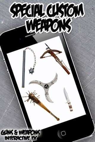 The interactive weapon effects actually let you see these weapons in action! Fire the guns at will and watch the recoil action and hear the sound effects. Use and swing the knives and swords! Support for accelerometer lets you move your iPhone to actually move the weapons too. Custom weapons are also available for added fun!