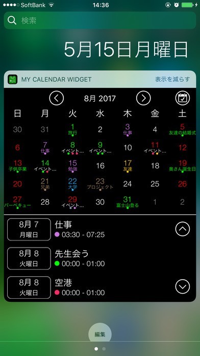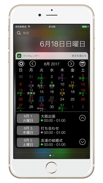 App Storeより引用マイカレンダーはアプリケーションとウィジェット通知画面にカレンダーが表示するアプリです。日、週、月単位でイベントを確認でき、今後予定されている予定を簡単に見ることができます。