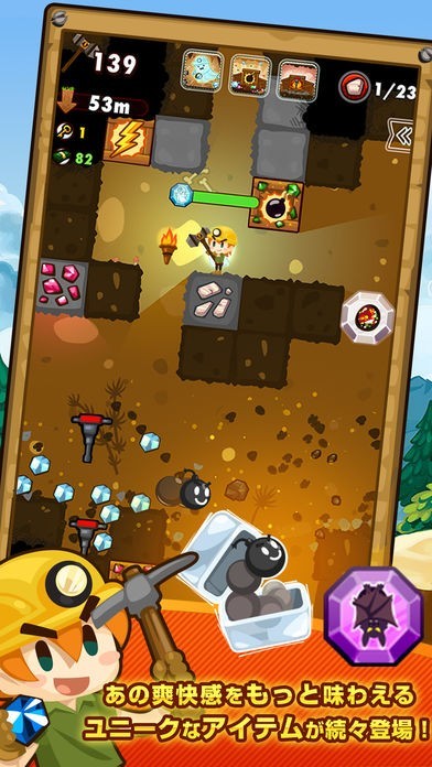 ひたすら地中深くを目指す穴掘りゲームになっています。道中にはトレジャーや一気に周囲を吹き飛ばす爆弾など様々な物が落ちています。これらを活用しながら目標ポイントを目指していきましょう。
