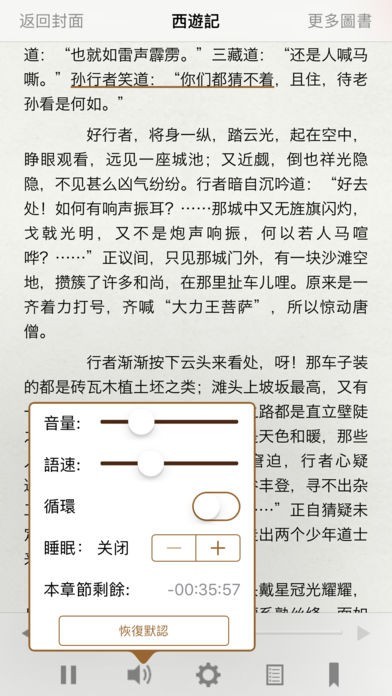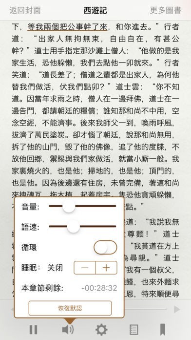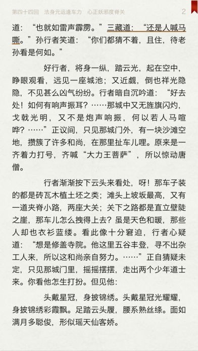 App Storeより引用Appstore上罕见的《西游记》应用: 边听边看、真人朗读、 文字实时同步、即指即播、自动翻页、朗读变速变调、字典查询、间繁切换、精美的字体, 清新的界面! 老少皆宜, 是值得收藏的版本!