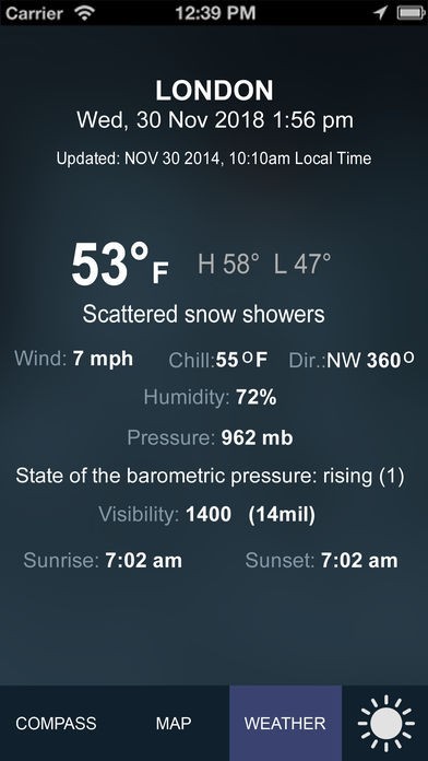 アプリではGPSのほかに、気象情報が提供されています。気温、風、湿度、日の出&日の入り時刻などの詳しい気象情報が手に入れましょう。旅行先の天気をチェックすれば、スケジュールを立てるときに役立つでしょう。