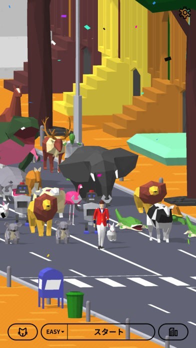 動物のパレードがだんだん大きくなっていくリズムゲームで、角ばったグラフィックがユニークです。