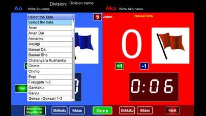 Karate Scoreboard Kataは空手の様々な型の判定を行うことができ、計算の手間のかかる採点も自動で行うことができ、スムーズに競技を進めることができます。