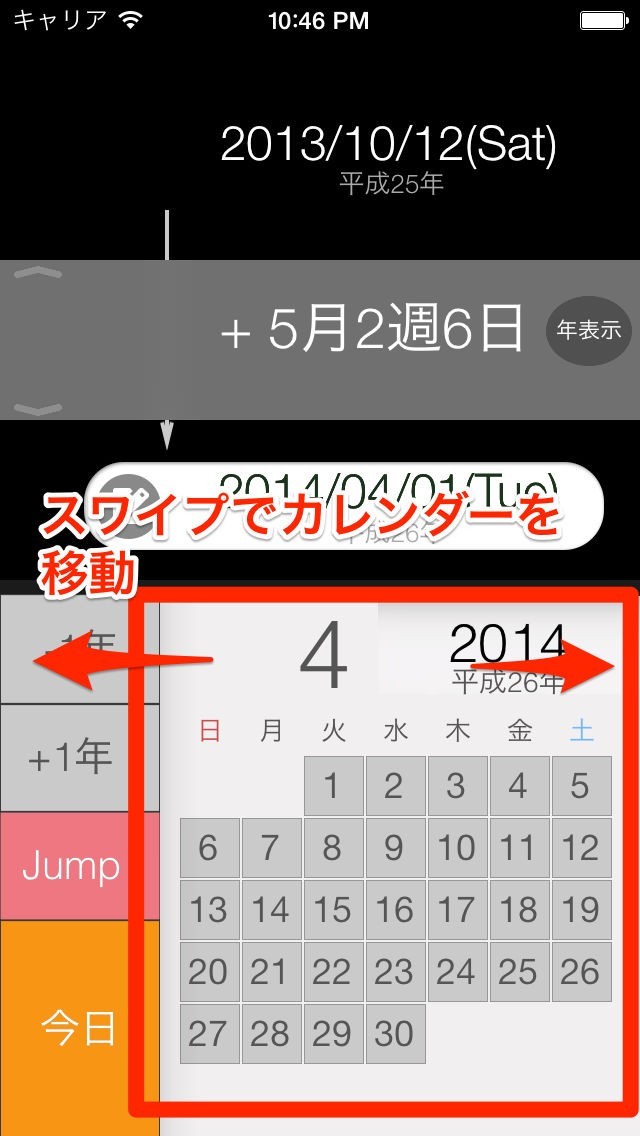 カレンダーを左右にフリックすると過去の月、未来の月へと切り替わります。