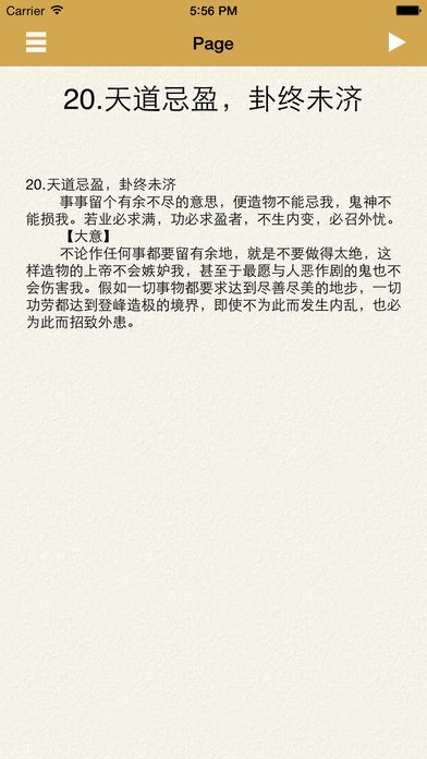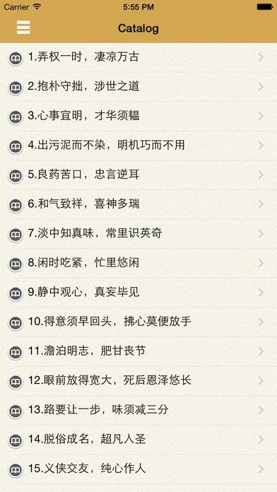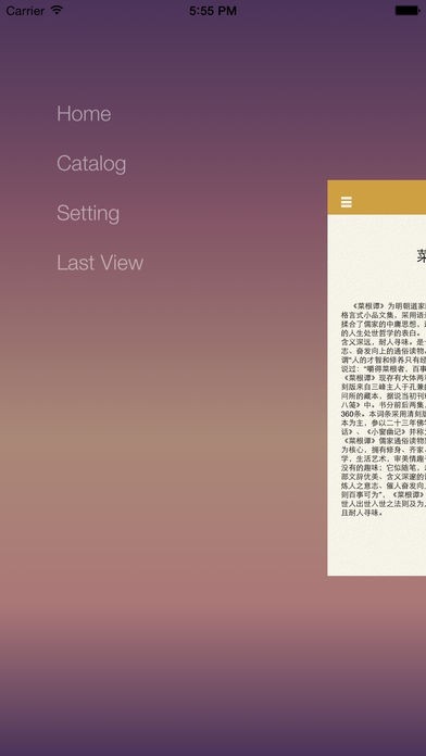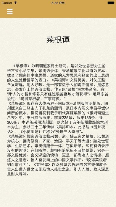 App Storeより引用菜根谭是明朝道家隐士,还初道人洪应明收集编著的一部论述修养、人生、处世、出世的语录世集,成书于万历年间。作为一部富有汉民族生活伦理思想的著作,它深刻的体现了汉族传统道德生活化的倾向。