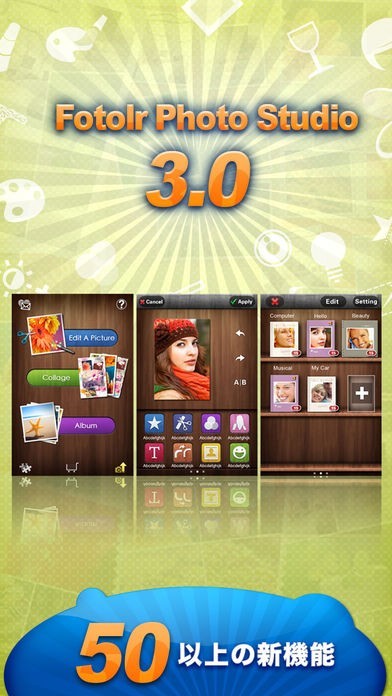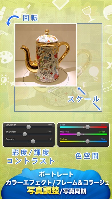写真処理用機能が50種類以上も付いた簡単、使いやすい写真画像編集アプリです。写真のカットや回転などの基本操作はもちろん、 写真サイズの調整、絵画機能、色彩などの調整も出来る優れものです。画面のシーン変更、文字の追加、枠や背景の変更はもちろん、カメラで撮影した自分の顔を痩せさせたり、にきびを消しの美顔補正、美白、口紅、カツラ、染髪など特殊な効果を入れる作業も可能です。また、アルバムを作ったり写真を共有たりして、世界中で400万人以上のユーザーと友達になる事も出来ます。