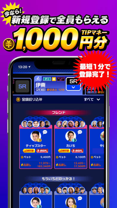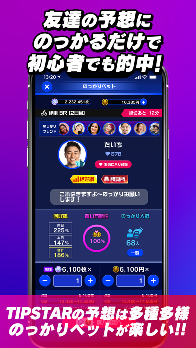競輪・オートレースが初めての方でも、フレンドやお気に入りの一般TIPSTAR(ティップスター)に「のっかりベット」をすれば、簡単操作で手軽に遊べる!