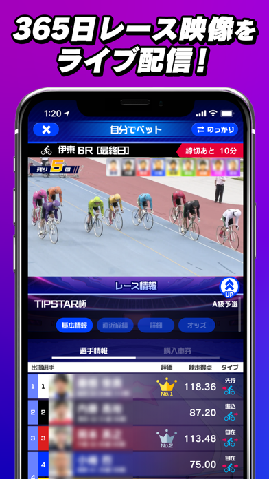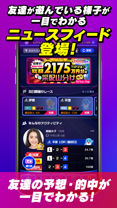 「TIPSTAR(ティップスター)」は、365日配信されるレース映像と、競輪(KEIRIN)・PIST6・オートレースのネット投票を、基本無料で、友達と一緒に楽しむことが出来るサービスです。