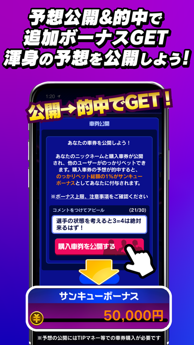 購入した車券を公開&的中すると、ボーナスゲットのチャンス!