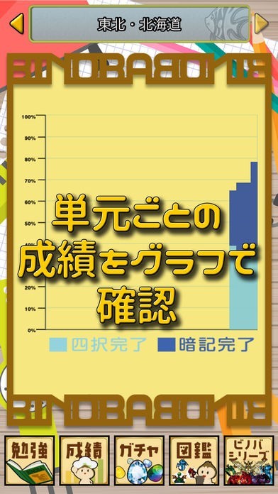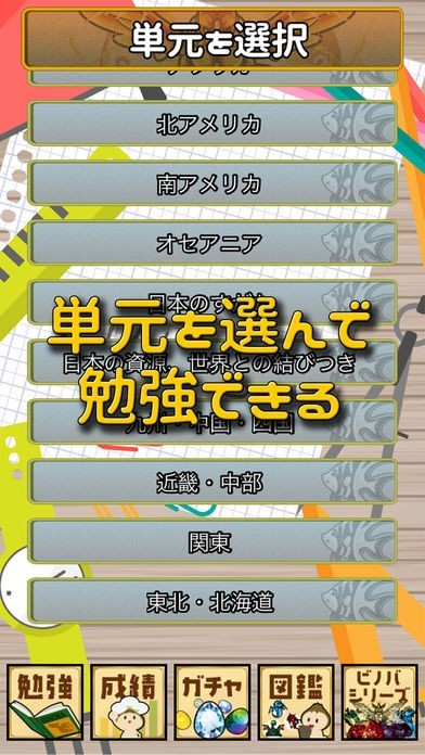 高校受験対策などに役立つ学習アプリ「ビノバ 中学 地理」では、単元ごとに学習できる勉強機能を用意しています。自分が苦手とする単元を集中的に学習したり、得意単元を伸ばしたりと、学習スタイルによって使い分けられるのが特徴です。成績機能では単元ごとの学習をグラフ表示可能。どれだけ学習したのかも一目で把握できるため、モチベーションの維持に役立てることができるでしょう。また、図鑑機能も用意。学習を行うことで可愛いモンスター「ビノモン」をゲットできるのがこのアプリならではの嬉しいポイントです。236種類のビノモンをすべてゲットして、図鑑コンプリートを目指してみてはいかがでしょうか。