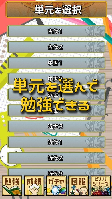 中学生が学ぶ歴史の問題を無理なく効率的に学習できるアプリです。定期テストや高校受験対策にピッタリ。暗記が苦手と言う方も、クイズ問題を解いて暗記問題を解くという2段階学習を行うのでスムーズに覚えられます。また、単元ごとに分かれているので自分の苦手な単元を重点的に学ぶこともできます。成績は単元ごとにグラフとして表示されるので、学習到達度も目で見てチェックできます。学習を進めるとポイントがもらえ、ポイントでモンスターをゲットできるという遊びもついているのがビノバの特徴です。勉強するときはしっかりとして、息抜きに遊ぶというバランスのとれた学習アプリとなっています。