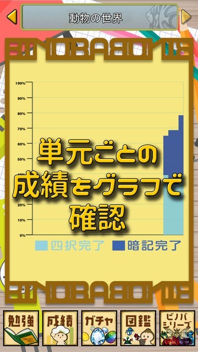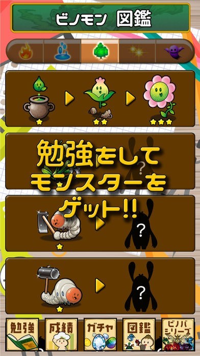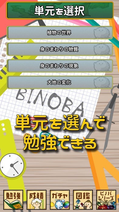 勉強もゲームみたいにできればいいのにと思ったことはありませんか? 「ビノバ 中学 理科 1年」には、ゲーム感覚で学習を進められる機能がたっぷり搭載されています! 楽しみながら続けられる秘訣はこのアプリならではのポイントやガチャでしょう。 理科の問題を解くたびにポイントが溜まり、ポイントでガチャを引くことができちゃいます。 ガチャでモンスターをゲットしながら勉強すれば、次のガチャが楽しみになること間違いなし! 遊びと勉強を両立させることができる学習アプリとなっています!