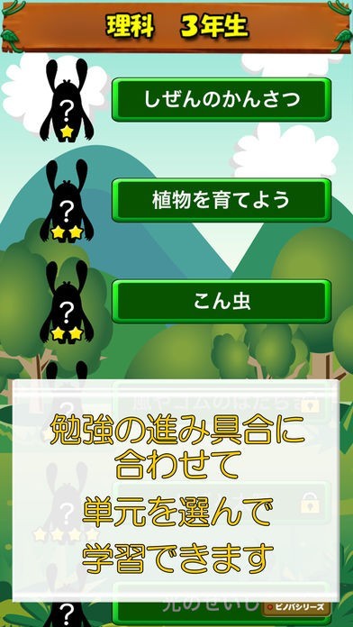 小学校3年生の理科アプリの決定版!学習の進み具合に合わせて単元を選択して、効率的に復習できます。4択のクイズ形式という使いやすさ、勉強のご褒美にモンスターを集めていく楽しさで、子供が継続的に勉強します。(iPad、iPhoneの両方に対応)
