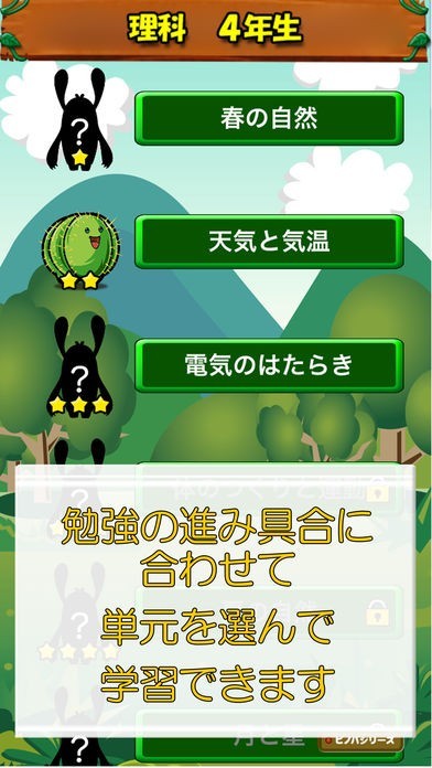 小学校4年生の理科アプリの決定版!学習の進み具合に合わせて単元を選択して、効率的に復習できます。4択のクイズ形式という使いやすさ、勉強のご褒美にモンスターを集めていく楽しさで、子供が継続的に勉強します。(iPad、iPhoneの両方に対応)