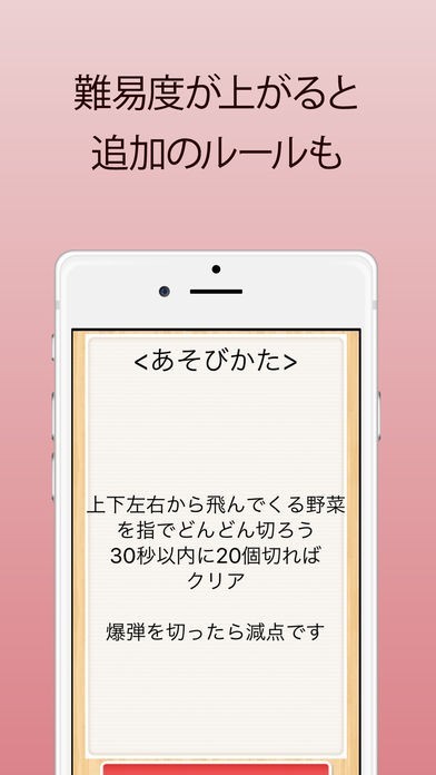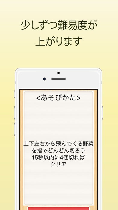画面に飛び込んでくる野菜のイラストを指でカット!遊びと頭の体操がセットのシニア向け教育ゲーム