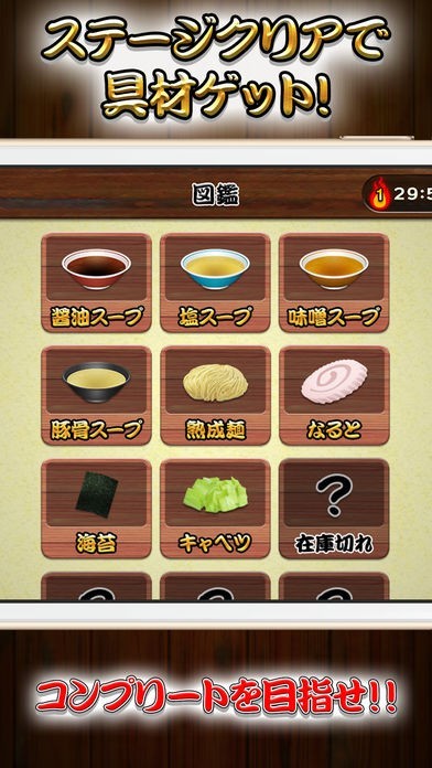 画面上に現れるラーメンの注文と同じものを画面下からタップして選んでいくミニゲームアプリです。 制限時間内に多くの注文をさばいてステージクリアを目指します。全部で80ステージ用意されているのでやりごたえがあります。 ステージをクリアするとラーメンの具材がもらえて、図鑑に登録されるのでコンプリートを目指しましょう。