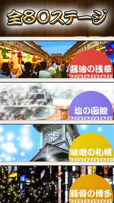 浅草・函館・札幌・博多がゲームの舞台となっていて、それぞれ醤油・塩・味噌・豚骨と異なるラーメンが用意されています。都市によってラーメンの具材が異なるので飽きずにプレイできます。