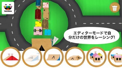 このゲームはエディターモードを搭載しています。ジャンプ台や動物、家などを自分の思うままに配置することができます。「トッカ・カー」は子供の想像力を豊かにする、子供のためのレースゲームです。