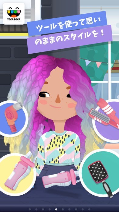 「Toca Hair Salon 3」は、美容師になってキャラクターの髪や髭、服装などを自由にコーディネートできる子供向けのゲームアプリです。 ゴールや正解・不正解などが一切設けられていないため、いつまでも楽しむことができます。 バリカン、͡コテ、ブラシなどのアイテムが豊富に揃っており、本格的なものから奇抜なものまで、枠にとらわれず自由な髪型をつくることができます。 子供ならではの自由な発想力で、美容師として色んなスタイリングに挑戦してみましょう。