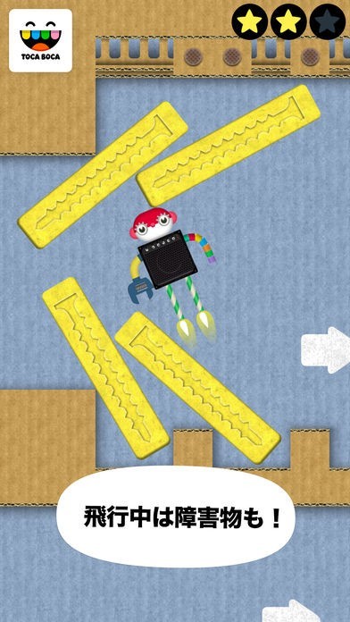 作ったロボットはテスト飛行施設で動かしてみることができます。テスト飛行では星をコレクションしたり障害物を破壊していくアクションゲームを楽しめます。巨大マグネットがゴールになります。