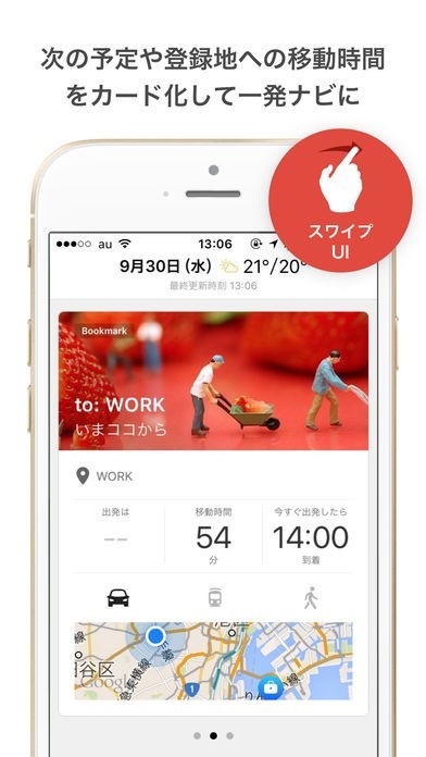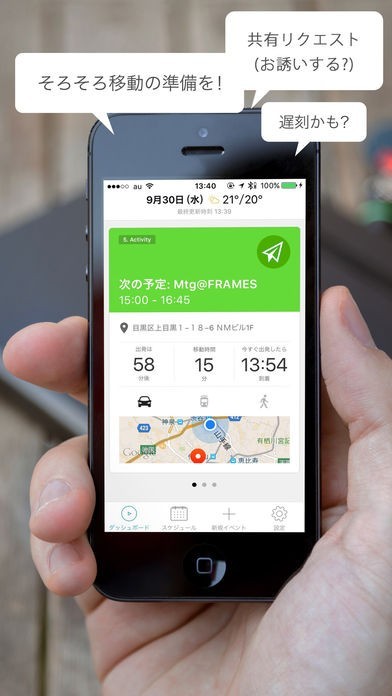 「PROPELa」では、カード型ナビが利用できるダッシュボード機能などを搭載しています。訪問予定の場所と一緒に、経路が判る地図も登録しておくことができるなど、使い勝手も抜群です。スケジュール機能では到着地点から自動的に出発時刻を計算できる他、次の予定をお知らせする便利な通知機能も充実。あらかじめスケジュールを登録しておくことで、出発するべき時間やイベントの開始時間が近づくと自動的に通知を送信してくれます。電車移動はもちろんのこと、車での移動にも対応しているため、取引先訪問や待ち合わせ、旅行など、多彩なシチュエーションで役立ってくれるでしょう。
