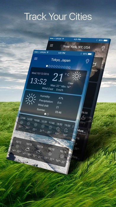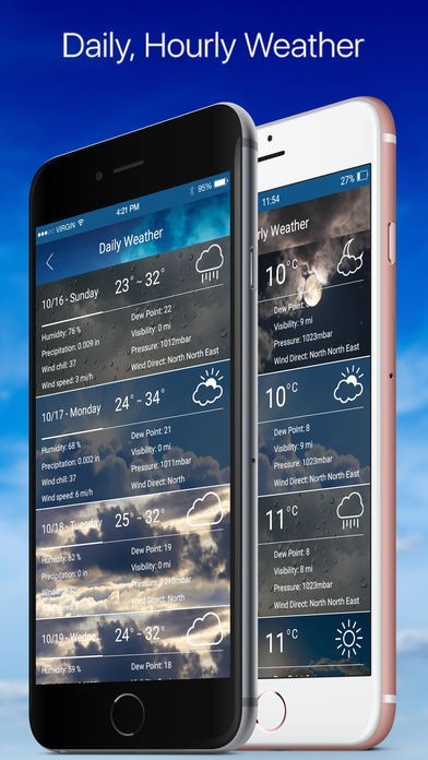 最低気温、最高気温はもちろん、体感温度まで表示されるので洋服を選ぶ際の参考にもなり、風速や、日の出、日の入りも表示されるためアウトドアアクティビティでも大活躍します。