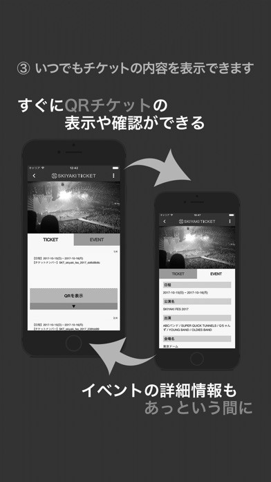 紙のチケットは偽造される危険性や、譲渡がしやすく、違法な転売が横行しています。そこで、このアプリは、スマートフォンがチケットになり、入場時のみ効果を発揮します。