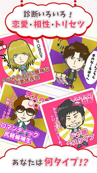 いろいろな診断をしてみたい方にも最適。キスタイプ診断などユニークな診断を多数搭載!