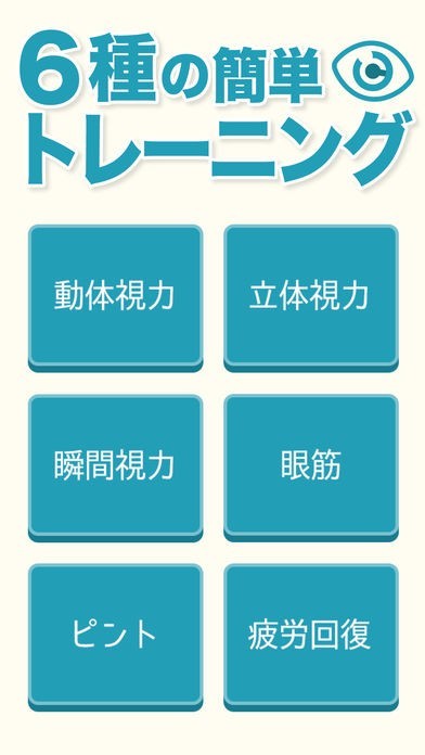 利用できるトレーニングは6種類ですべて無料。眼筋、ピント機能、動体視力、立体視力、瞬間視力、疲労回復。これら複数のトレーニングにより、視力回復を効率的に図ることが可能。