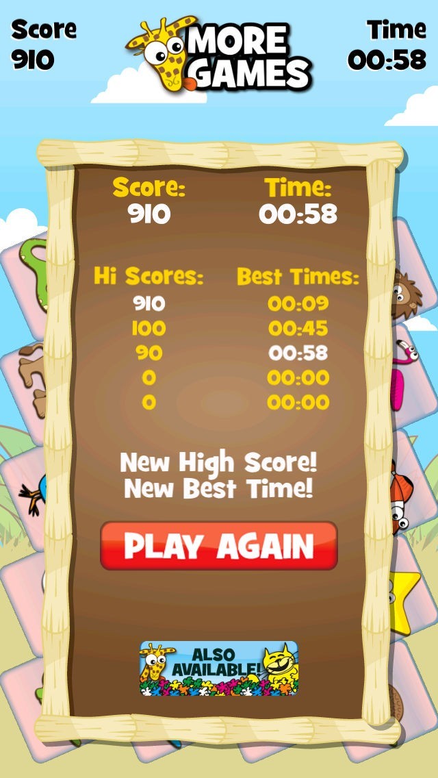 Best scores and times are saved (even after the app is closed). Can you beat your best time?