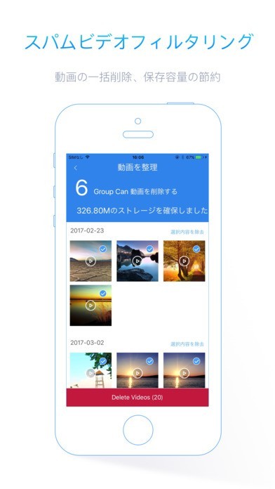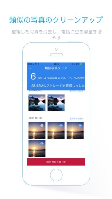 - 多様なグラフィックマッチングアルゴリズムを使って重複または類似の写真や動画を検出し、スマホのストレージスペースを節約します。