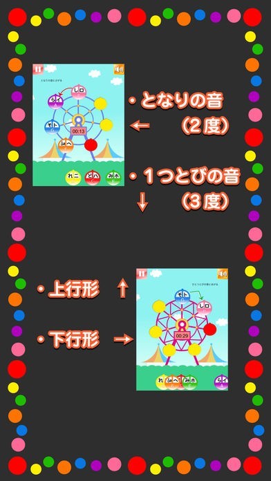 モード選択があり、観覧車に当てはめる音の規則を変更することが出来ます。2度、3度と音を飛ばす感覚を開けることが可能なので音の並びを丸暗記するだけでなく応用力も身につきます。