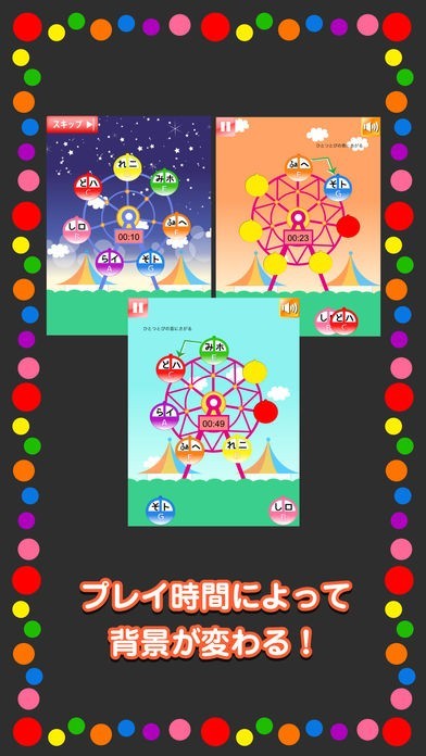 色とりどりの観覧車に音をスライドして載せていく直観的な操作方法です。子供にもわかりやすくかわいい色使いになっているので何歳でも、どなたでも遊んでいただくことのできるアプリです。