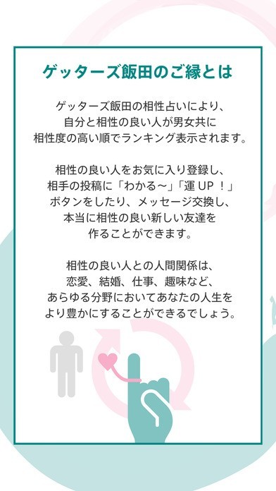 「ゲッターズ飯田のご縁」は、まじめに幸せになるために友達作りをするアプリです。不真面目な目的な方は、お断りしております。