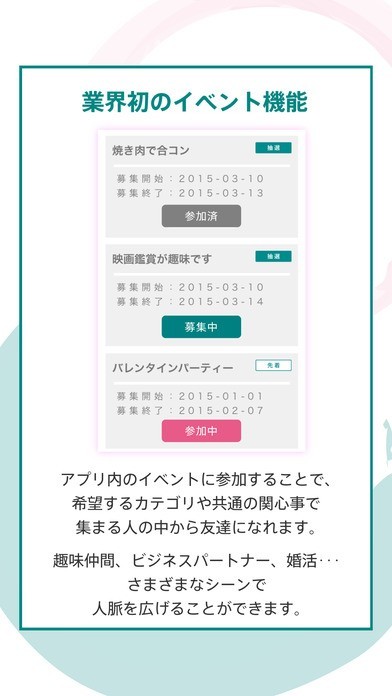 アプリ内のイベントに参加することで、共通の条件や、関心事で集まる人の中からランキングが表示され、友達になれます。