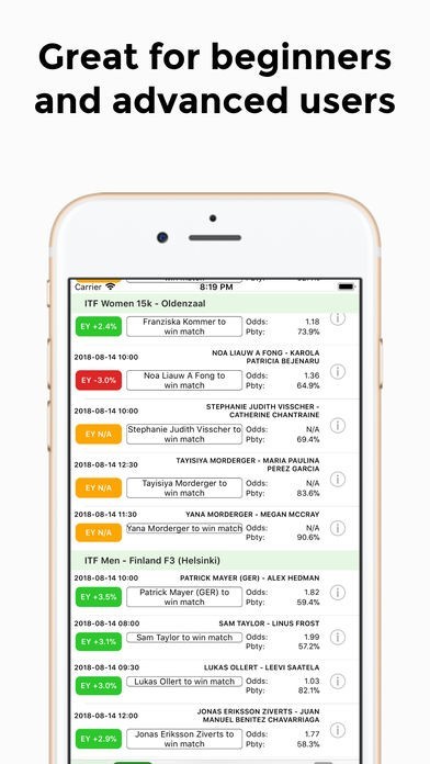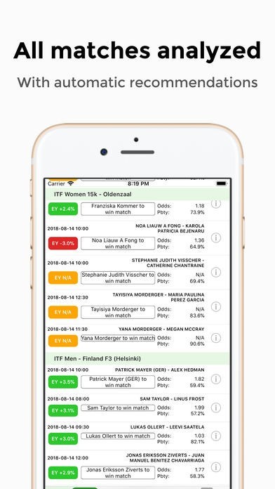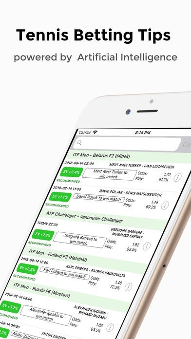 Using statistics and machine learning we analyze all professional tennis matches and provide recommendations with probability and expected yield assigned to every prediction.