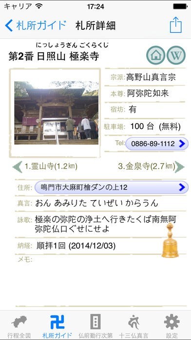 スマホの位置情報活用で、現在地から最も近い札所を検索できます。距離も表示してくれるので、あとどれくらい歩けば到着するのかが把握ができて便利です。初めてお遍路参りをする方には嬉しい機能です